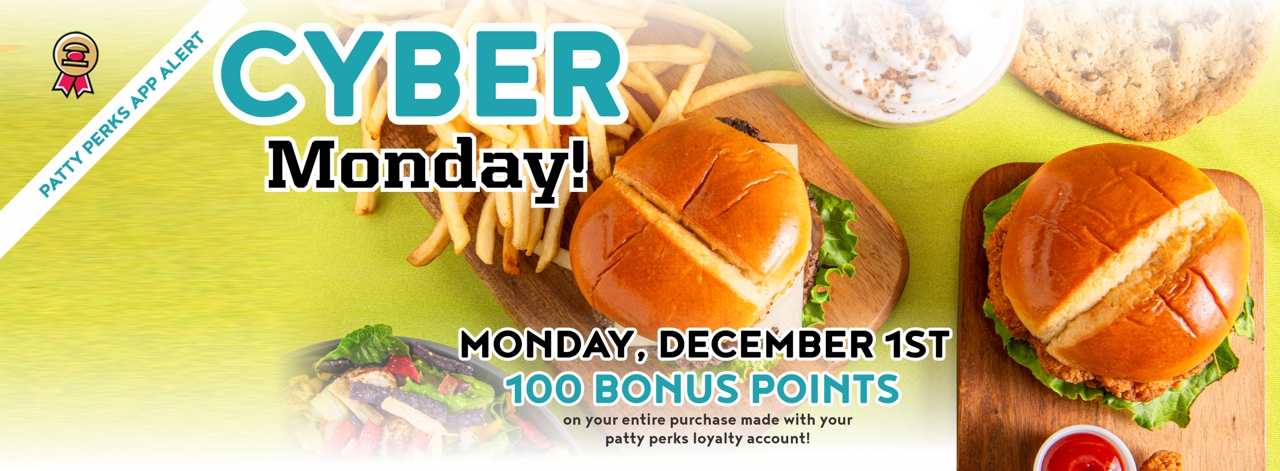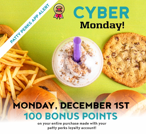 Use your Patty Perks App Monday December 1st to receive 100 Bonus Points