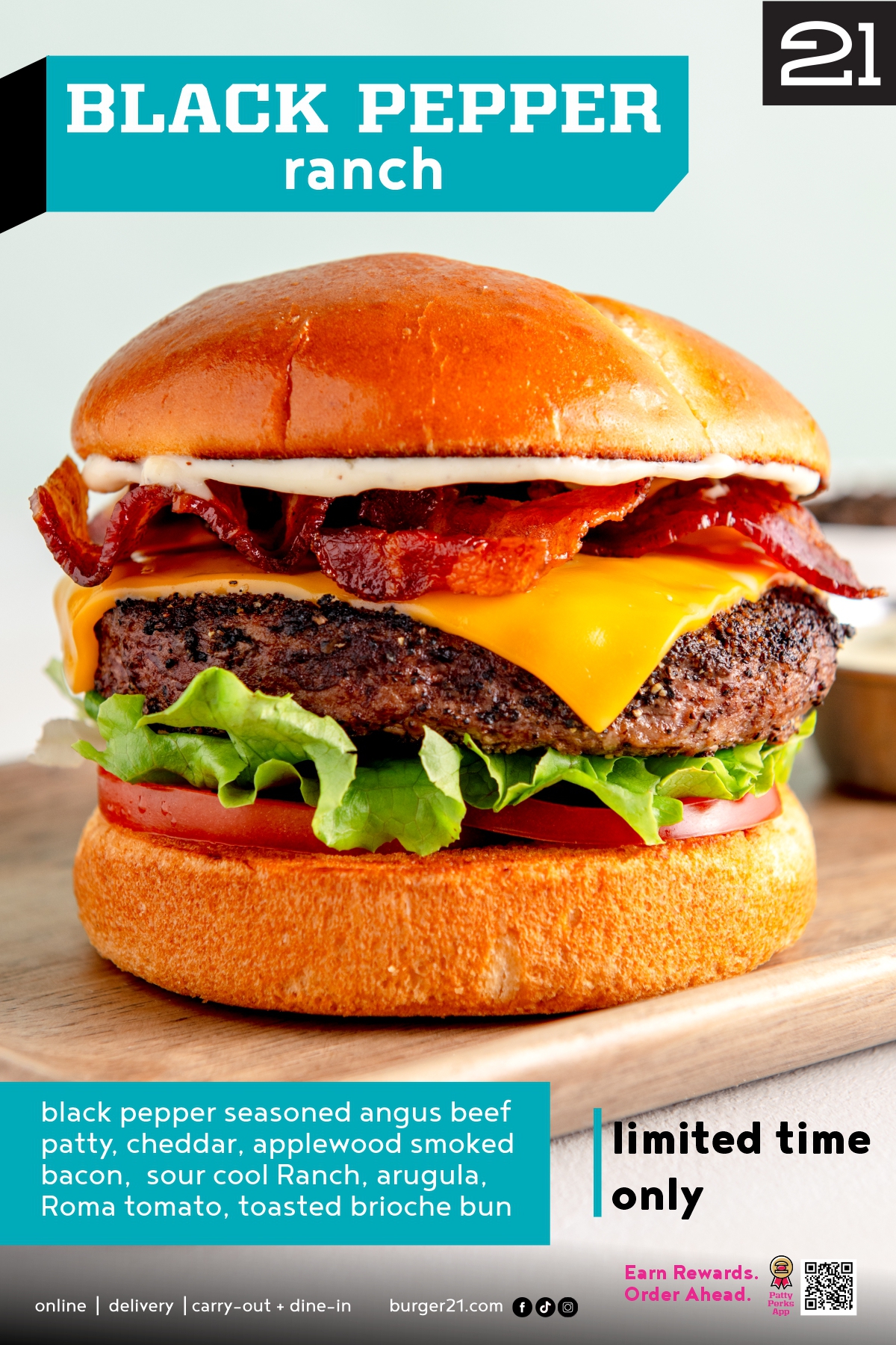 black pepper seasoned angus beef patty, cheddar, applewood smoked bacon, cool Ranch, arugula, Roma tomato, toasted brioche bun. Available January 1st – February 25th, 2024.
