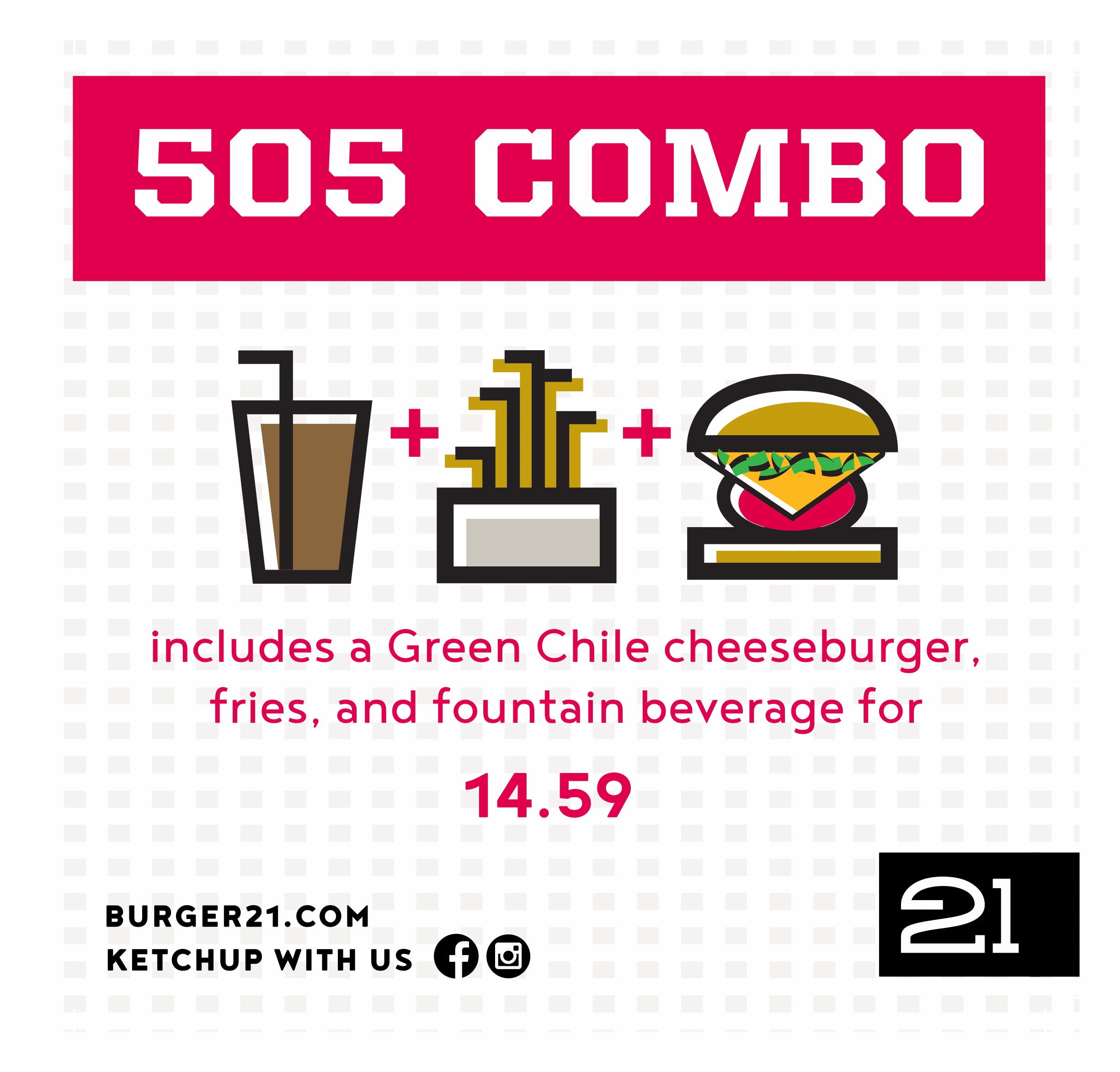 Get a taste of New Mexico when you order the 505 Combo. A Green Chile Cheesy Burger with a side of fries and a fountain drink for an outstanding price of just $15.69