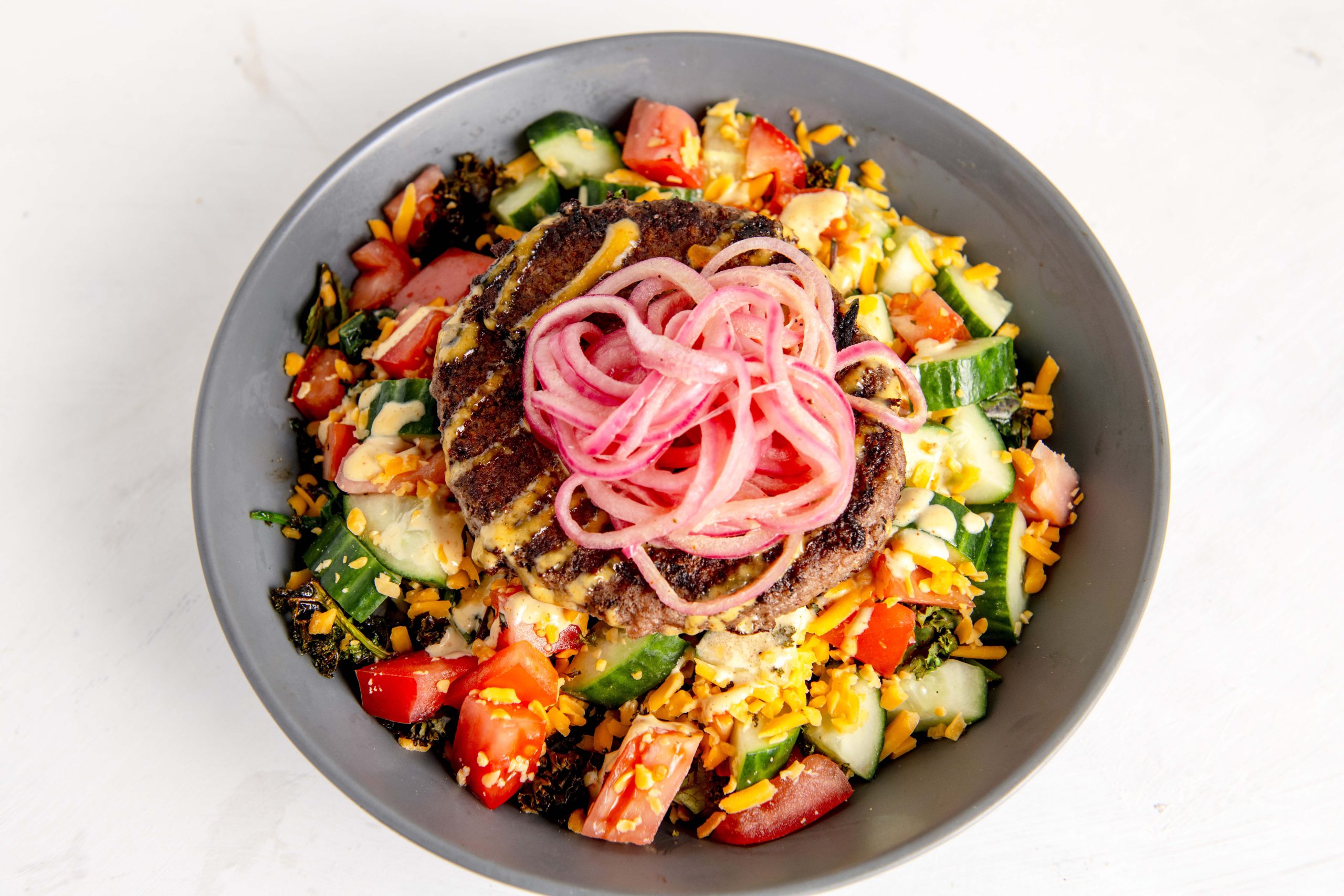 American Bowl*brown rice + quinoa, mixed greens, cucumbers, tomatoes, cheddar, angus beef patty, pickled red onion |